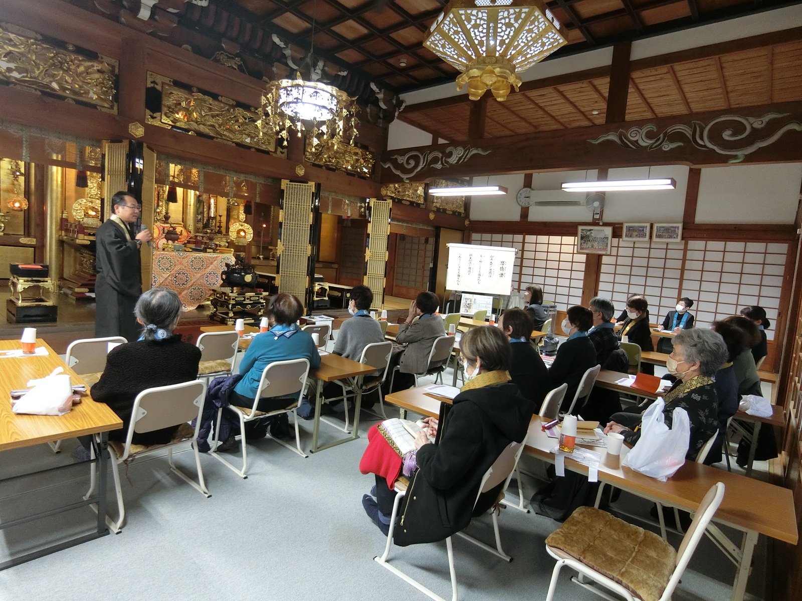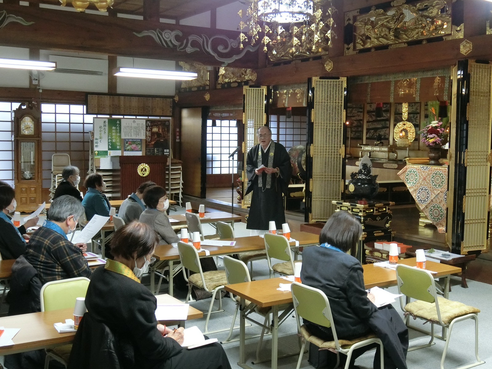 その後、お供えのお菓子を下ろし、お茶とともに休憩を取った後、住職から本堂正面のご本尊・親鸞聖人・蓮如上人・聖徳太子・七高僧の絵像、および長楽寺では報恩講法要から御正忌法要迄安置している、親鸞聖人の御生涯を絵に描いた四幅の掛軸「御絵伝」の説明がありました。