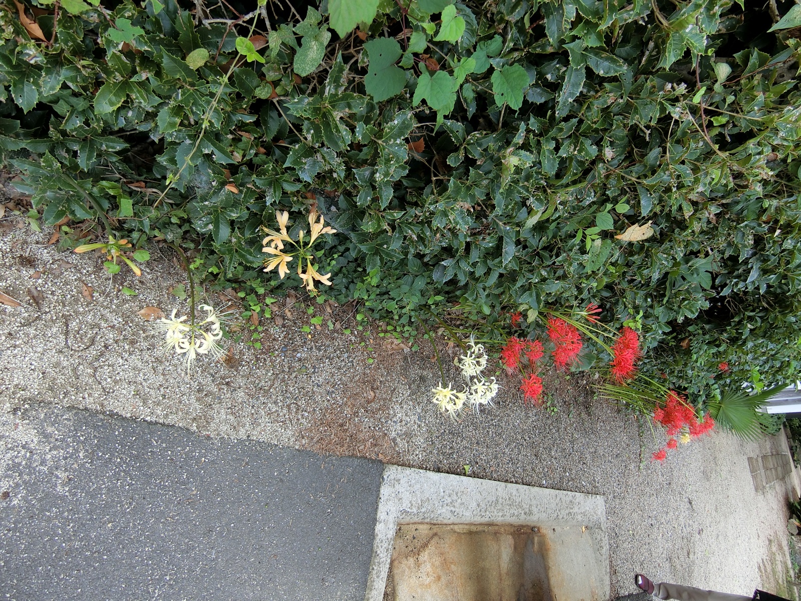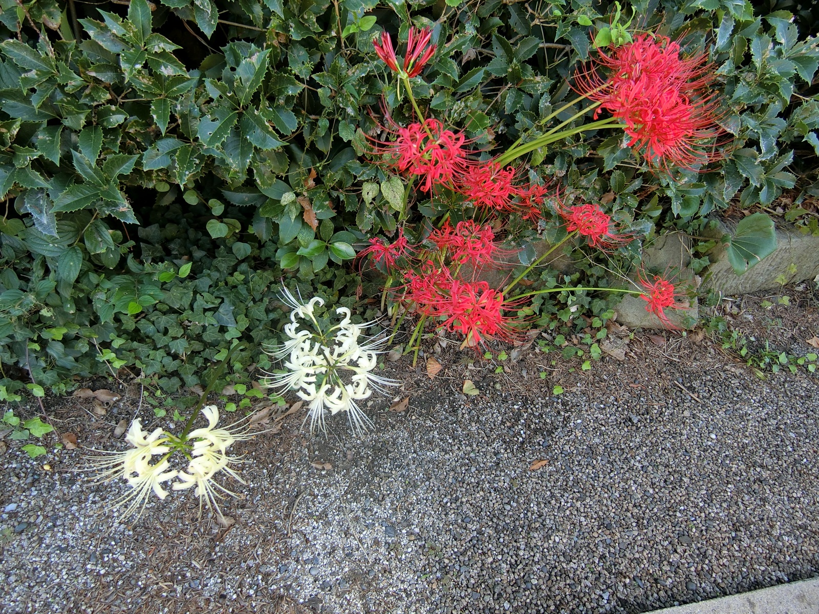 猛暑に続いた今年ですが秋彼岸を迎えて本堂後ろに彼岸花が咲きました。 今までの赤い花と、昨年門徒さんが植えて下さいました白・黄色の花が並んで咲いています。